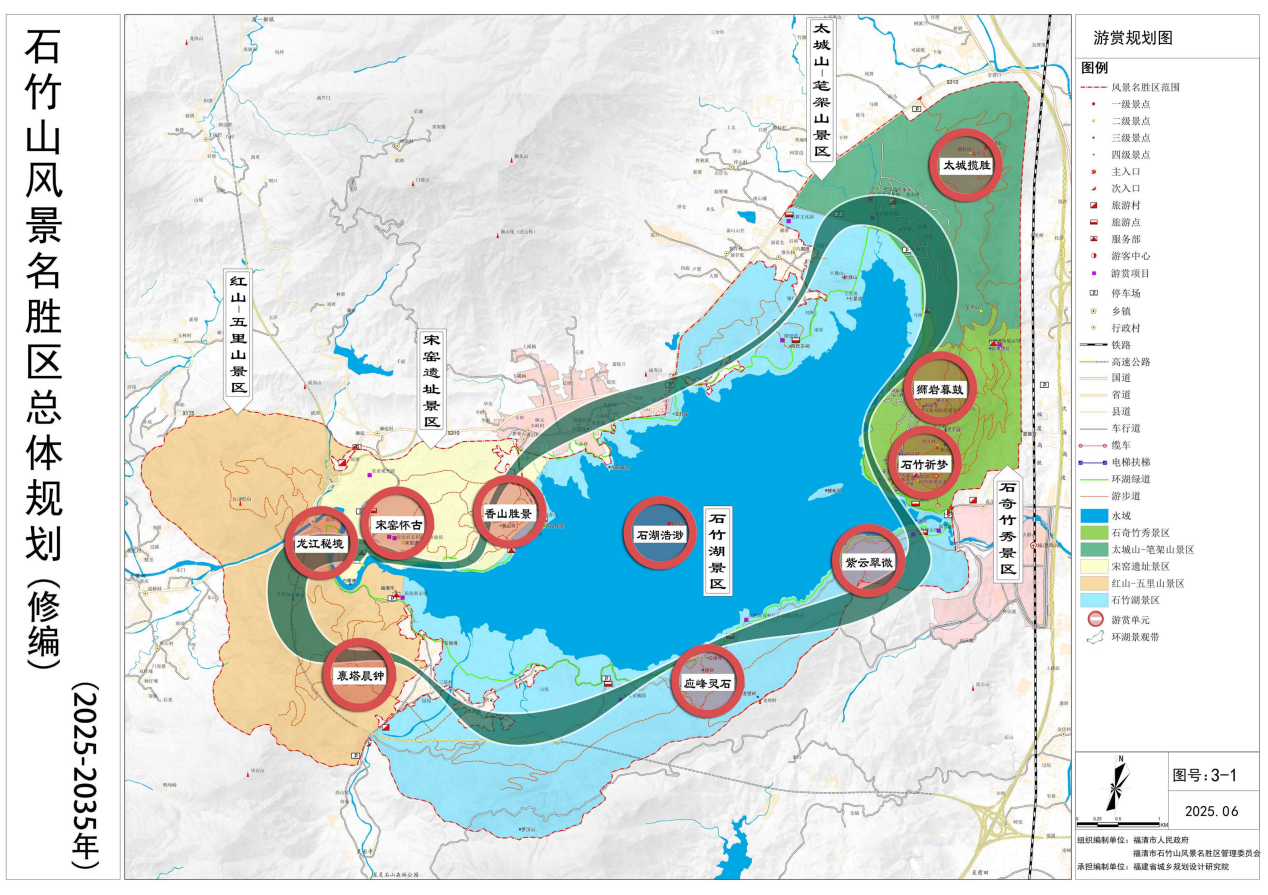 游赏规划图(图源:《石竹山风景名胜区总体规划(修编)(2025-2035年)公示稿》) 省政府在批复中强调,要严格保护石竹湖水源地和自然人文景观的原真性与完整性,控制建设活动,落实分级保护要求,并将《总体规划》纳入国土空间规划“一张图”管理,确保风景名胜区可持续发展。 |