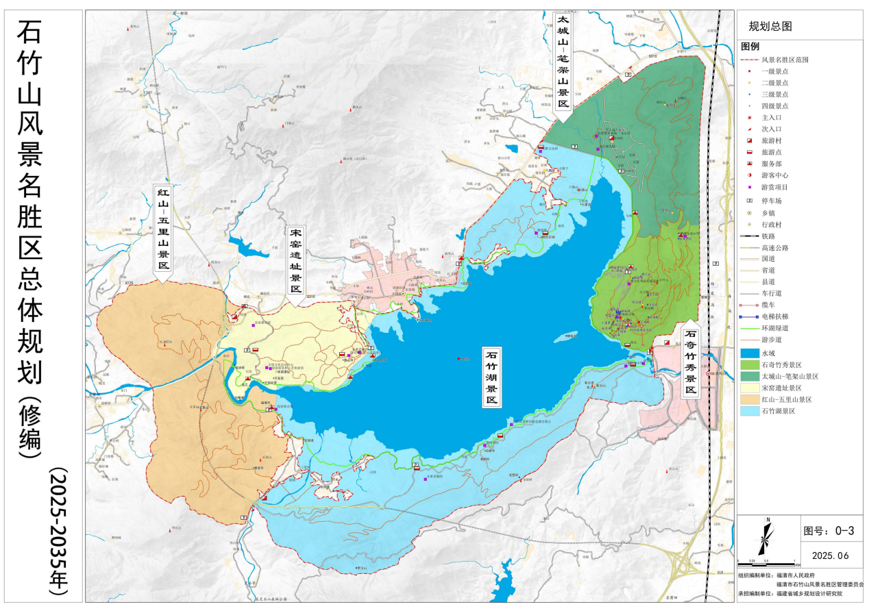 总体规划图(图源:《石竹山风景名胜区总体规划(修编)(2025-2035年)公示稿》) 根据规划,景区将新建悬空栈道、景观索桥、森林步道等游览设施,设置13处停车场,提升索道系统,并建设环湖绿道、观湖平台、自然教育基地等。同时,全面引入智慧旅游系统,实现景区数字化、智能化管理。